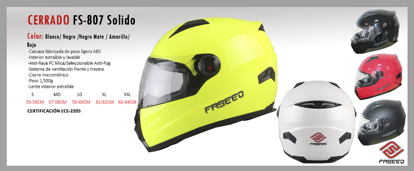 CASCO FASEED SOLIDO CERTIFICADO ECE R22-05 COLORES: ROJO, AMARILLO, NEGRO MATE, BLANCO, NEGRO TALLAS: S,M,L,XL,XXL