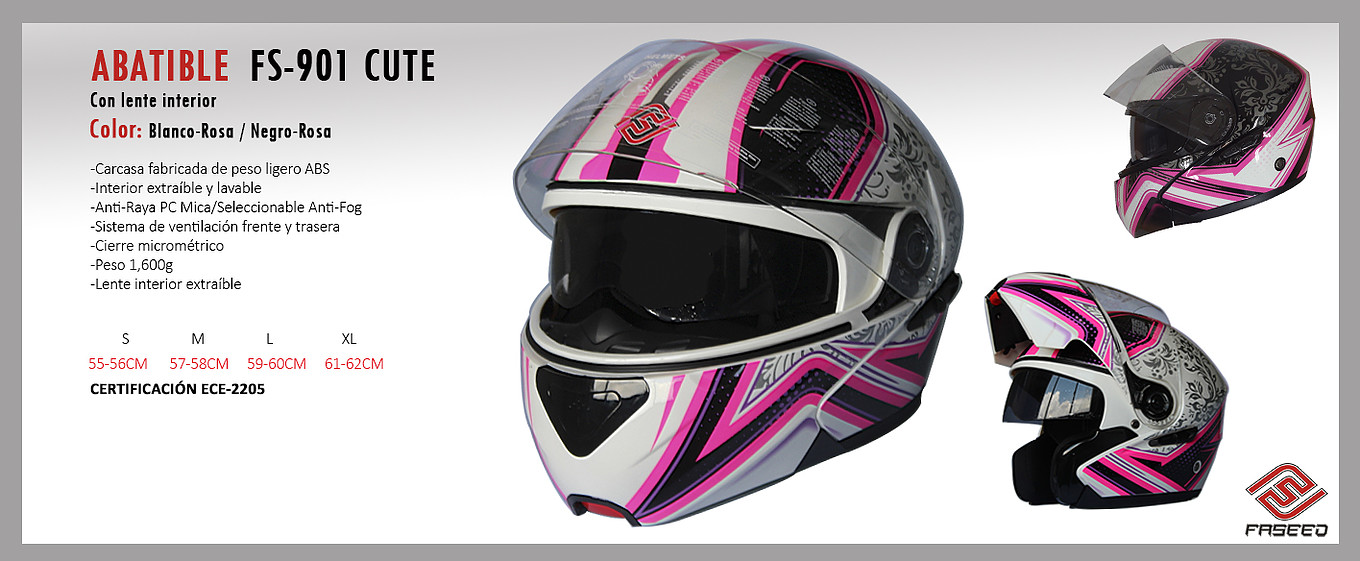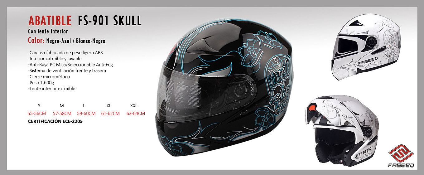 CASCO FASSED ABATIBLE CERTIFICADO ECE-2205, MODELOS: DECAL SKULL, DECAL CUTE, DECAL L2, AVENTURA, STILETTO, ASLAN, ASPEN, ASTRA, VIPER, TALLAS: M,L,XL,XXL