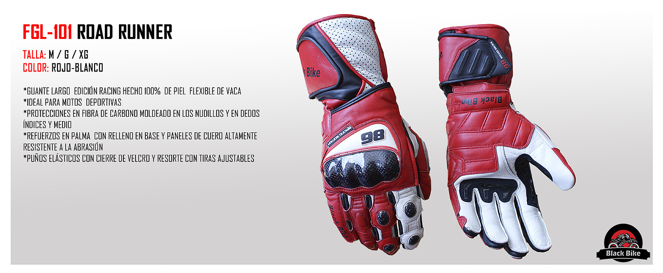 GUANTES LARGOS DE PIEL FASEED FGL-101 ROAD RUNNER COLOR: ROJO/BLANCO TALLAS: M,L,XL
